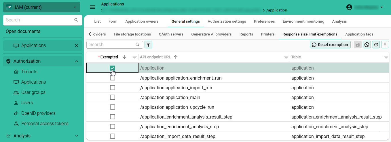 - In the Intelligent Application Manager, go to the menu Authorization > Applications > General settings > tab Response size limit exemption.