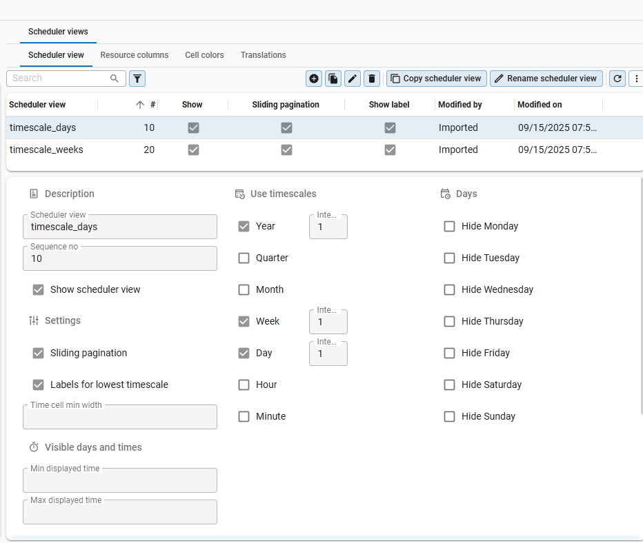 For Scheduler views, you can further customize their appearance by hiding days and hours that are not relevant. This allows you to display only working days and hours, for example. You can also now configure the time cell width to further improve visibility.