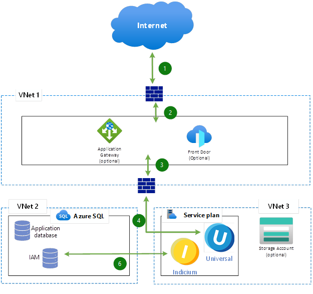 Secured traffic is routed to Azure App Service or similar hosting environments. - Service Plan (App) → Azure Storage Account (VNet 3, optional)