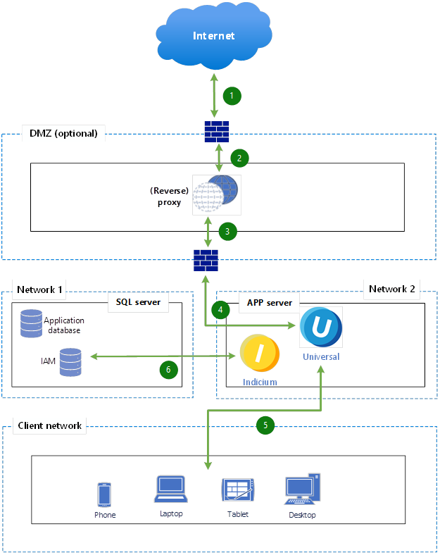 Internal clients (phones, laptops, tablets, desktops) connect directly to the application servers. - App Server → SQL Server (Network 1)