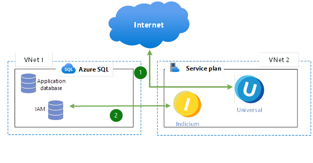 Traffic from the Internet or external Azure services reaches Azure SQL Database directly, typically via secured endpoints. - Application Server (VNet 2) → Azure SQL Database (VNet 1)