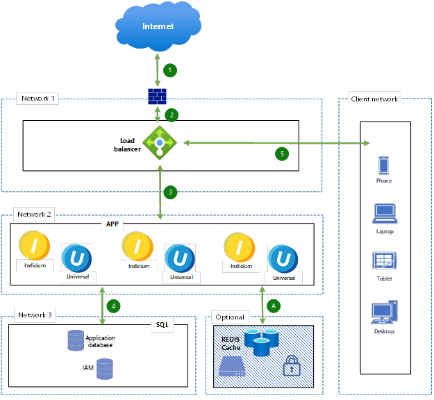 Indicium instances connect to the database for authentication and data retrieval. - Load Balancer → Client Network