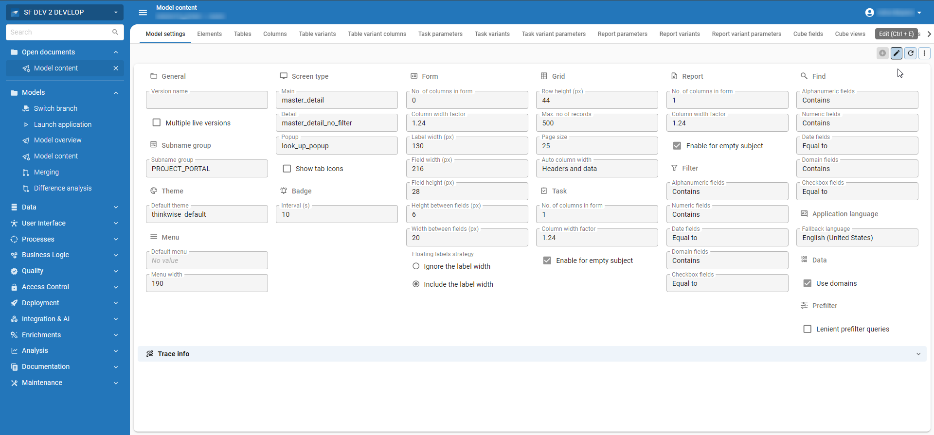 Like all other modelers, the Model content screen is linked to your selected model and branch. See Switch to another model or branch.