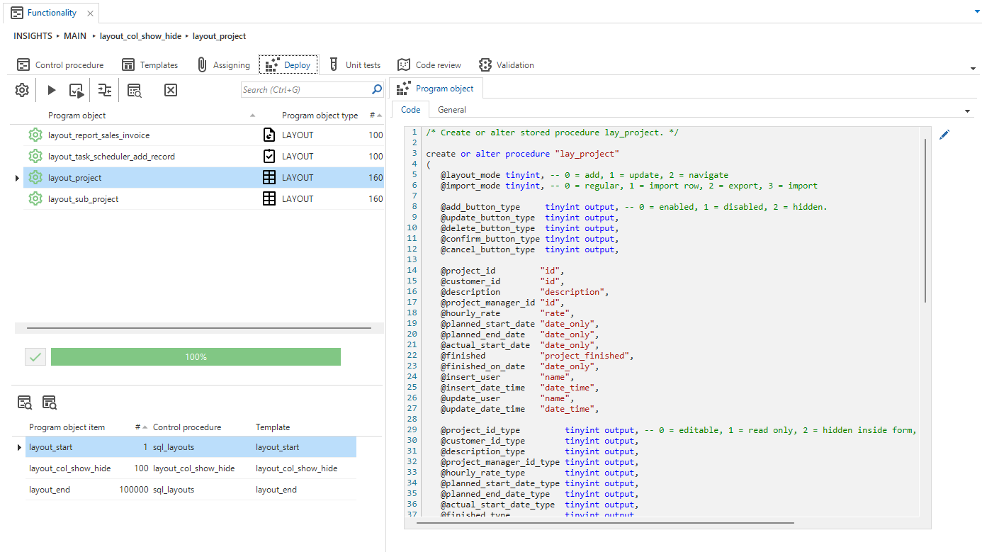Functionality is written in the form of code templates, based on the functional description which has been drawn up when modeling the application logic. A control procedure always contains one or more templates.