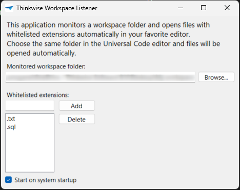 - Optional. Select the checkbox Start on system startup to automatically start the Thinkwise Workspace Listener when you start up your computer.