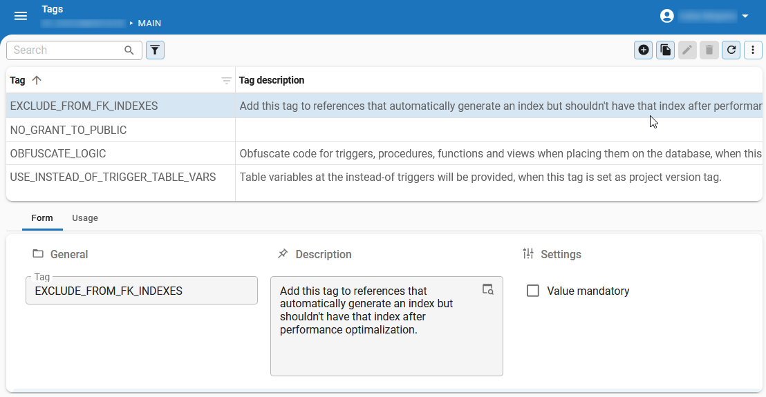 A tag is a freely definable property that can be linked to rows of a table and can be provided with a value. They provide information that is not available in the Software Factory's meta model.