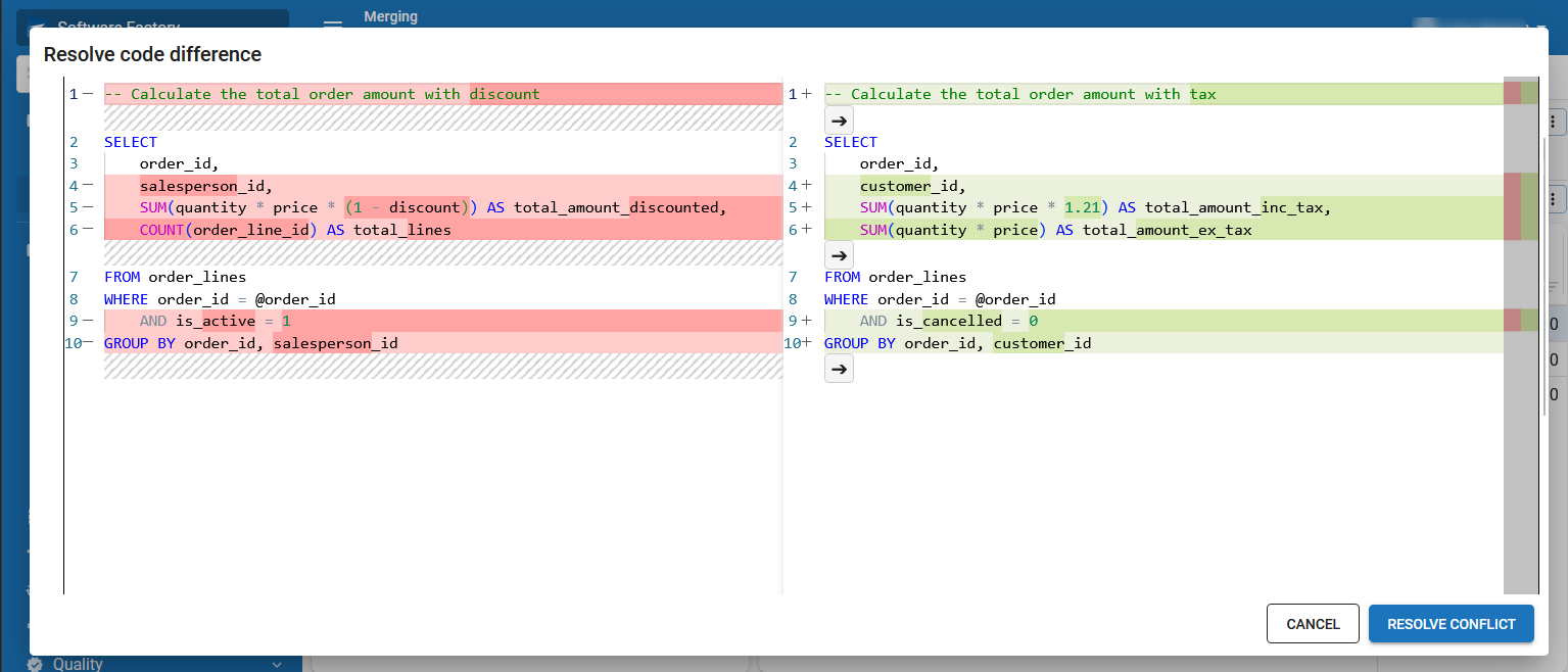 Resolve code differences in the code editor