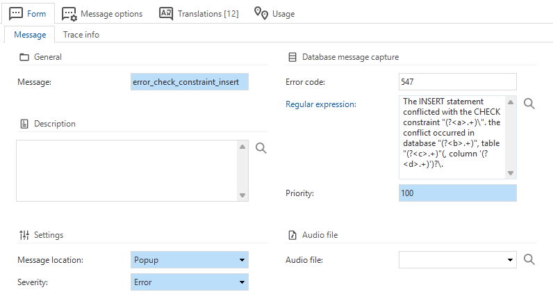 Error messages, warnings or informational error messages are also modelled in the Software Factory, with the possibility to define a translation, severity and location. This applies to messages that you add to your functionality (code templates) and messages caused by database errors, such as constraint errors.