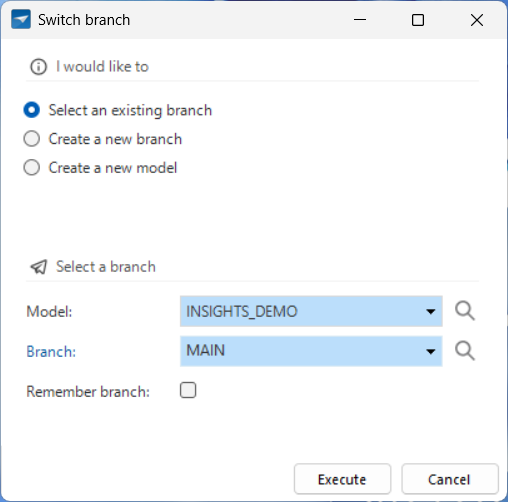 - Optional. Select the checkbox Remember branch to make this your default branch for the model.