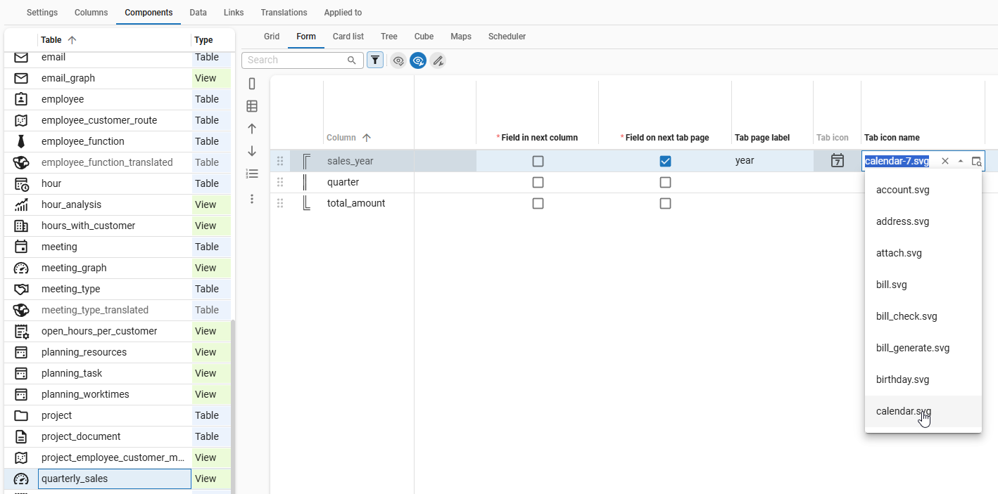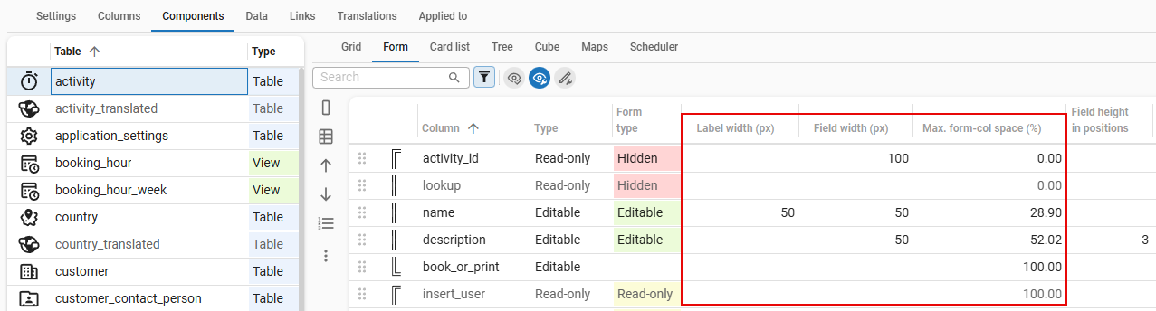 The settings for the grid, form and card list can be changed in the Components tab.