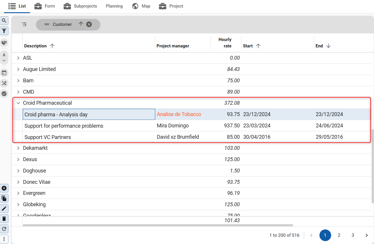 The example below shows a grid with grouped columns: the planned start and end dates are grouped under the label Planned date, and the actual start and end dates are grouped under the label Actual date. Without grouping, the column names would be too long to fit in the grid, for example Planned start date and Planned end date.
