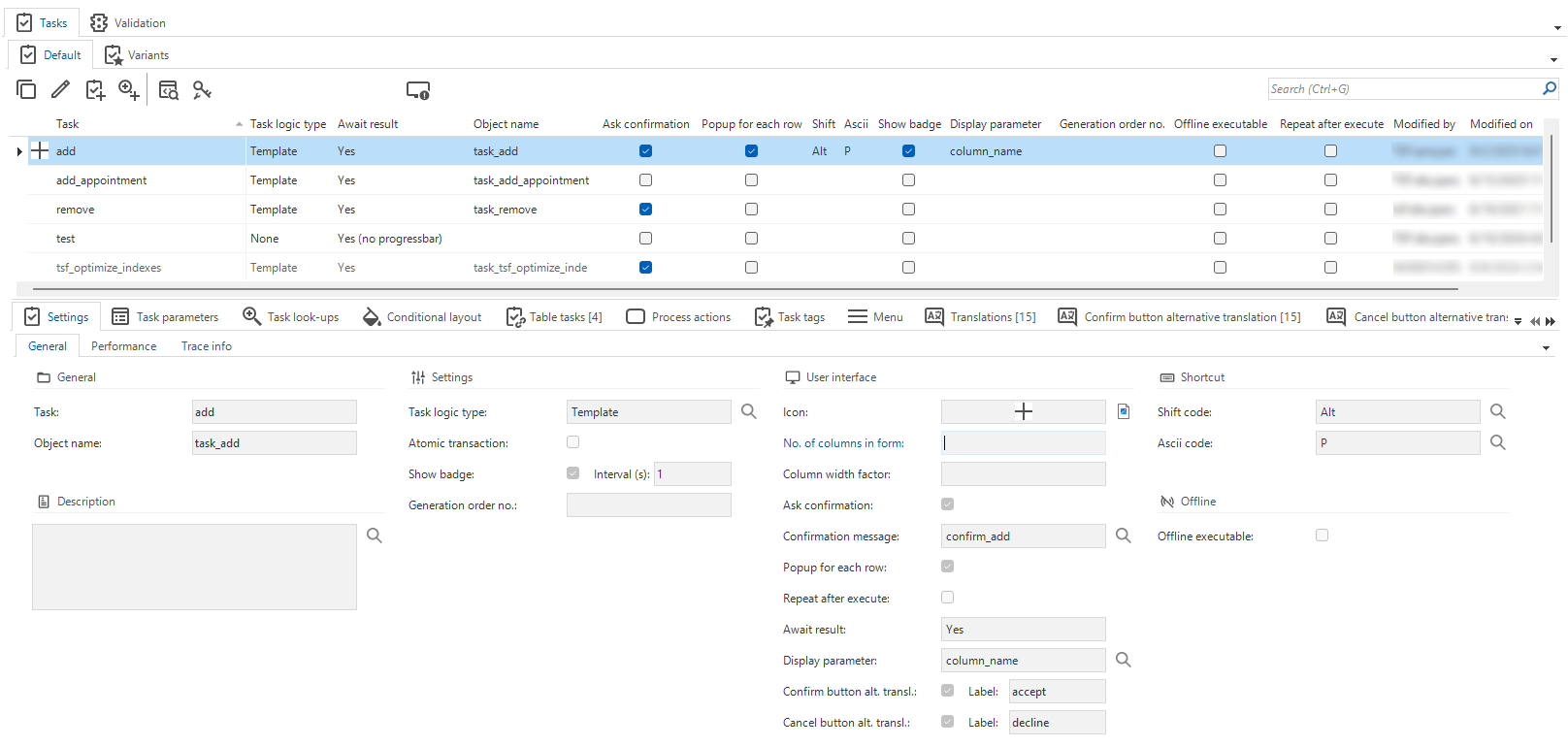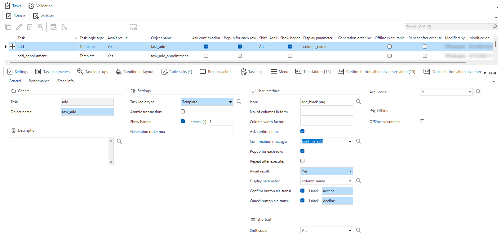 A task has a default and a layout mechanism, just as a table. A shortcut combination can also be defined with which the task can be started using the keyboard.