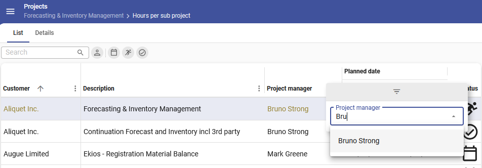 For example, for a screen with project details, you can define prefilters for the project status. You have defined prefilter In progress as active by default. If a user opens the screen, only the projects with status In progress are shown. They can disable this prefilter and select the prefilter Planned to see all the planned projects. Disabling all prefilters would show all the projects.